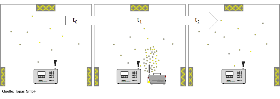 In order to remove potential particle contamination quickly, the air exchange rate in cleanrooms must always be sufficiently high. During recovery time measurement, test aerosols are introduced into the room. The decay curve of the particle concentration and thus the recovery time of the room to the original concentration level is then measured. With this Topas technology, you will be successful in your recovery time measurements: ATM 228 aerosol generator, CPA 341 cleanroom particle analyzer, CRQWin cleanroom qualification software.
